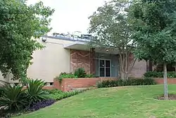 The Delta Kappa Gamma Society International Headquarters Building is a historic building at 416 West 12th Street in Austin, Texas. Since its construction in 1956, this International style building has housed the international headquarters of Delta Kappa Gamma, a professional society supporting the advancement of women founded in 1929. It was designed by the Austin firm Kuehne, Brooks and Barr. Architecturally, it is a C-shaped concrete and steel structure, two stories in height, with a main upper level, and a second basement level that is partially obscured by the sloping terrain of the lot. Its design includes hallmarks of the International style propounded by Ludwig Mies van der Rohe: intersecting horizontal and vertical planes that highlight a variety of materials, including different colors of brick, concrete blocks, and marble.[2]