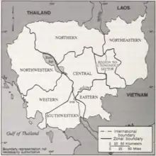 The Khmer Rouge government did away with all former Cambodian traditional administrative divisions. Instead of provinces, Democratic Kampuchea was divided into geographic zones, derived from divisions established by the Khmer Rouge when they fought against the ill-fated Khmer Republic led by General Lon Nol.[15] There were seven zones, namely the Northwest, the North, the Northeast, the East, the Southwest, the West and the center, plus two Special Regions, i.e. the Kratie Special Region no 505 and (before mid-1977) the Siemreap Special Region no 106.[16]