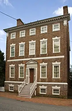 The Denton House, also known as the Denton-Weeks House, the River House, and the Smyth-Letherbury House, is a historic residence at 107 Water Street in Chestertown, Maryland. It is a three-story brick building, with a five-bay front facade framed by corner pilasters with stone capitals. The building has a raised basement, with a stone stringcourse between it and the first floor. The front entrance is centered, with an elaborate surround consisting of pilasters, entablature and dentillated gable. The house was built about 1784 by Richard Smyth, the son of one of the area's wealthiest merchants. In 1791 it was bought by Peregrine Letherbury, the first law professor at Washington College.[2]