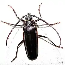 This is a large brown beetle about 64 mm long with antennae that are about half the length of the body. There are short spines on the thorax. The elytra are brown.[3]