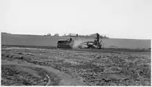 Mechanized road-grading. Des Lacs NWR, ND, 1938. A small bulldozer pulls a riding plow in open fields, with farm buildings and crops in background