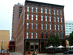 The Des Moines Saddlery Company Building is a historic building located in downtown Des Moines, Iowa, United States. It was built in 1881 by J. Rubelman of Muscatine, Iowa.[2] He choose to move his operation to Des Moines because of its location on two rivers and the 13 railroads that served the city. It was one of four saddlery firms in a two block area.[3] Rubelman's company made saddles, harnesses and leather works for 20 years. In the years since it has housed a shoe maker, rubber company, stove manufacturer, glove company, the Krispy Kone Company and the Kaplan Hat Company. The later was also the name of the restaurant that was located on the first floor.