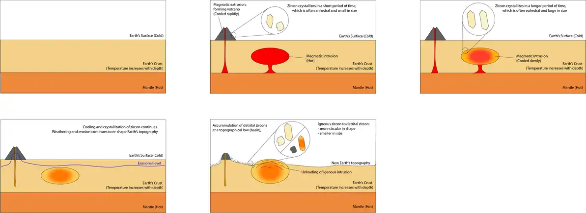 | Resulting zircon record | Youngest detrital zircon grain is approximately the onset of sediment accumulation[35] | High, especially within periods of supercontinent | Youngest detrital zircon provide a maximum depositional age much older than the onset of sediment accumulation |