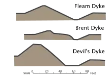 There have been a number of excavations and investigations of the dyke in modern times, notably in 1923, 1988 and 1991. Excavations in 1923/24 of a stretch of dyke close to a Roman house yielded Roman artefacts under the dyke, indicating a post-Roman construction date. The results of a 1988 electrical resistance survey of the point where the ancient Street Way cuts through the dyke were inconclusive. In 1991, little was found when a small part of the dyke (measuring 8 × 3 metres (26.2 × 9.8 ft)) was excavated prior to the construction of a new aqueduct. The Dyke is thought most likely to be Anglo-Saxon, by analogy to the similar Fleam Dyke for which radiocarbon dating was performed in the 1990s, with Fleam Dyke's earliest construction phase dated within the uncertainty range of AD 330 – 510.[5] The site is a Scheduled Monument.[6]