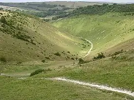 Devil's Dyke is a 100 metre (300') deep V-shaped dry valley on the South Downs in Sussex in southern England, 5 miles (8.0 km) north-west of Brighton. It is managed by the National Trust, and is also part of the Beeding Hill to Newtimber Hill Site of Special Scientific Interest.[1] Devil's Dyke was a major local tourist attraction in the late 19th and early 20th centuries. It is now a popular viewpoint and site for walking, model aircraft flying and hang gliding.[2] The South Downs Way passes the site.