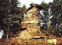 The Devil's Table (German: Teufelstisch or Salzwooger Teufelstisch) of Salzwoog, in the municipality of Lemberg, is a striking mushroom rock in the German part of the Wasgau that covers the southern part of the Palatinate Forest in the state of Rhineland-Palatinate. The rock formation lies 5 km southwest of the largest and far better known Devil's Table of Hinterweidenthal, which also has a more impressive "table shape".