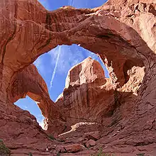 Devils Garden[note 1] is an area of Arches National Park, located near Moab, Utah, United States,[2] that features a series of rock fins and arches formed by erosion.[3] The Devils Garden Trail, including more primitive sections and spurs, meanders through the area for 7.2 mi (11.6 km).[4] The trailhead leads directly to Landscape Arch after a 0.8 mi (1.3 km) outbound hike, while Tunnel Arch and Pine Tree Arch can be seen on spur trails on the way to Landscape Arch.[3] Several other arches, including Partition, Navajo, Double O, and Private Arch, as well as the Dark Angel monolith and Fin Canyon, are accessed via the primitive loop trail and its spurs.[3]