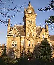 The infirmary moved to a more permanent home on the Halifax Road in 1883: the distinctive new building was designed in the gothic revival style by Kirk & Sons of Dewsbury.[1] After the infirmary had left the site, this building was taken over by the West Riding County Council and was renamed the "Municipal Buildings" and more recently has simply become known as "Boothroyds".[2]