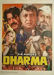 Dharma is a 1973 Bollywood action film directed by Chand. The film stars Pran in the title role. The rest of the cast includes Ajit, Madan Puri, Bindu and the pair Navin Nischol and Rekha. The film became a "Superhit" at the box office.[1] It was remade into the Telugu film Na Pere Bhagavan (1976).