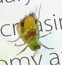 Diabrotica speciosa, also known as the cucurbit beetle and in Spanish as vaquita de San Antonio (this common name is also given to many ladybugs) is an insect pest native to South America. Its larvae feed on the roots of crops.[1][2][3] The cucurbit beetle is also known to transmit several viruses such as comoviruses and different mosaic viruses. This is native to South America and is now distributed in Central America and other global areas.