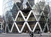 A diagrid (a portmanteau of diagonal grid) is a framework of diagonally intersecting metal, concrete, or wooden beams that is used in the construction of buildings and roofs.[1] It requires less structural steel than a conventional steel frame. Hearst Tower in New York City, designed by Norman Foster, uses 21 percent less steel than a standard design.[2] The diagrid obviates the need for columns and can be used to make large column-free expanses of roofing.[3] Another iconic building designed by Foster, 30 St Mary Axe, in London, UK, known as "The Gherkin", also uses the diagrid system.