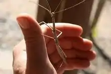 Diapheromera covilleae, the creosote bush walkingstick, is a species of stick insect in the family Diapheromeridae.[1] They are about 5 to 10 centimetres (2.0 to 3.9 in) long depending on the sex, with large tarsal hooks at the end of each leg for superior grip to branches or other objects. They have small eyes and horn-like spines on the head and anus. Since they do not have wings, they travel by walking along branches of trees and bushes, sometimes walking along the ground in search for the next perch or food source. Females are usually 3 to 4 centimetres (1.2 to 1.6 in) longer than males and have a larger body. Females are also grey in color while males are more brown.[2]