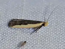 The wingspan is about 12 mm (0.47 in). The costal half of the forewings is creamy white and the dorsal half is dark brown.[3] Adults are on wing from April to October.