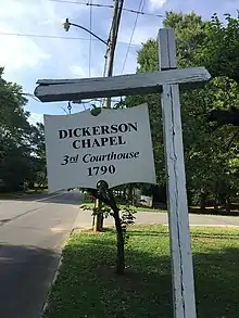 Dickerson Chapel was built in 1790 as the third courthouse for Orange County, North Carolina. It served as the county's courthouse until 1844, when the court relocated to what is known as the Old Courthouse.[1] The building was located on the corner of Churton and King Streets in Hillsborough. In 1845, the courthouse was purchased by Rev. Elias Dodson, the first Baptist minister in Hillsborough. Dodson had the building relocated to its present site on the corner of Churton and Queen Streets and reopened it as the First Baptist Church of Hillsborough.[2] It served as a Baptist church until 1862, when the property was purchased by three Quakers from Pennsylvania, who converted the building into a school for African-American children. In 1886 the chapel was given to trustees of the African Methodist Episcopal Church.[3][4]