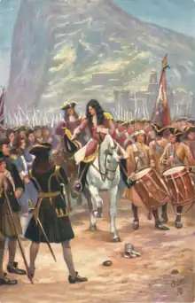 Salinas y Rodríguez was appointed Governor of Gibraltar by Philip V in December 1701. He arrived on The Rock in early 1702. With the start of hostilities in the War of the Spanish Succession and the threat of the Anglo-Dutch fleet, Salinas y Rodríguez requested reinforcements which were never sent.[1] On 1 August 1704, English marines under the command of Prince George of Hesse-Darmstadt (who had been Viceroy of Catalonia until 1701[3] ) landed on the isthmus north of The Rock from the Bay of Gibraltar and after preparing a three-pronged attack plan sent a message asking for surrender.[2] Salinas did not accept, and the city came under investment on 3 August by the Anglo-Dutch fleet.[2] Recognising the gravity of the situation and the futility of further resistance, Salinas y Rodríguez surrendered on the morning of 4 August.[1][4]