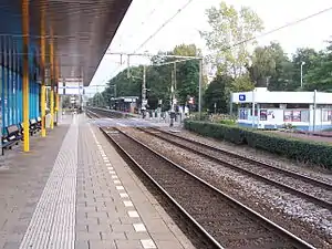 Diemen (abbreviation: Dmn) is the main railway station of the municipality of Diemen, Netherlands. It is located on the Amsterdam–Zutphen railway between Amsterdam Science Park and Weesp. The station was first opened in 1882 and then closed in 1929. It was reopened at the same location in 1974. The station building was completed in 1978. The train services are operated by Nederlandse Spoorwegen. Among the direct destinations are Almere, Amersfoort, Amsterdam Centraal, Hilversum, Lelystad, and Zwolle. There are connections to two bus services operated by GVB.