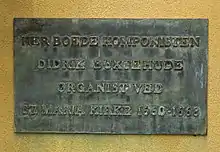 He is thought to have been born with the name Diderich Buxtehude.[3] His parents were Johannes (Hans Jensen) Buxtehude and Helle Jespersdatter. His father originated from Oldesloe in the Duchy of Holstein, which at that time was a part of the Danish realms in Northern Germany. Scholars dispute both the year and country of Dieterich's birth, although most now accept that he was born in 1637 in Helsingborg, Skåne at the time part of Denmark (but now part of Sweden).[2] His obituary stated that "he recognized Denmark as his native country, whence he came to our region; he lived about 70 years".[4] Others, however, claim that he was born at Oldesloe.[5] Later in his life he Germanized his name and began signing documents Dieterich Buxtehude.[3]