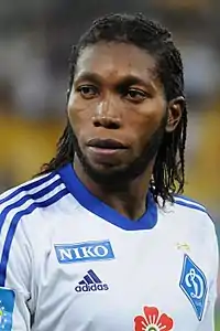 Mbokani (right) playing for Dynamo Kyiv in 2014