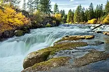 Dillon Falls are rapids on the Deschutes River in the U.S. state of Oregon near Bend in the Deschutes National Forest. With a pitch of 76.5°, the falls are a significant obstacle to whitewater running and are rated Class 5.