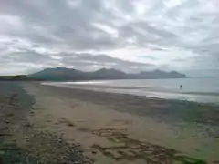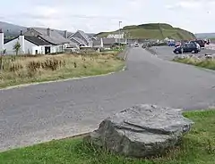 The cliff above the beach is known as Boncan Dinas and is occupied by an Iron Age hillfort, Dinas Dinlle. This fort has been eroded by the sea, such that only a double semi-circular rampart remains. Finds of Roman pottery suggest reoccupation in the 2nd or 3rd centuries CE.[2] The fort is about 164 yards from north to south by 120 yards with an entrance on the south west. It is possible that a Roman lighthouse originally stood here.[3] It is possible to make out small depressions which are thought to indicate the sites of Iron Age huts and the mound may be the remains of a barrow.[4]