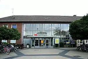 In 1916 a new entrance building was built. This was almost completely destroyed in the Second World War along with the other facilities at the station on 23 March 1945.[9] 100 years after the opening of the first station, the current station building was opened on 10 July 1956. It is a two-story building with a flat hip roof. The counter area, which is two storeys high, is marked by a limestone framed glass facade.[10]