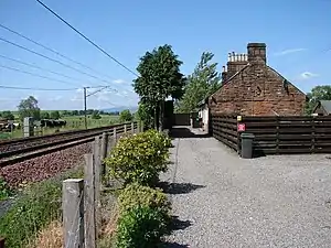 Trains pass at speed on the electrified West Coast Main Line. The stationmaster's house is now a private dwelling and the platforms have been demolished; the station cottages also survive as private dwellings. A signal box controlled the level crossing on the minor road which has now been closed and an overbridge built nearby.
