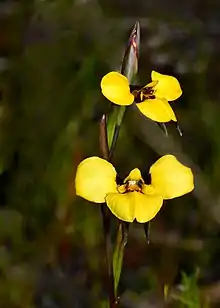 Diuris purdiei, commonly known as Purdie's donkey orchid,[2] is a species of orchid that is endemic to the south-west of Western Australia. It has between five and ten leaves at its base and up to eight pale yellow flowers with reddish-brown or purplish markings. It mainly grows in swampy areas and only flowers after fires the previous summer.