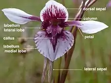 There are up to four flowers arranged on a raceme 10–40 cm (4–20 in) high, each flower about 25 mm (1 in) wide. The flowers are white to lilac-coloured with many purple lines and blotches. The dorsal sepal is broadly egg-shaped, 9–12 mm (0.4–0.5 in) long, 4–9 mm (0.2–0.4 in) wide and forms a hood over the column. The lateral sepals are linear to lance-shaped, 11–18 mm (0.4–0.7 in) long, 2–3.5 mm (0.08–0.1 in) wide and hang vertically below the flower. The petals are narrow egg-shaped, 3–10 mm (0.1–0.4 in) long, 3–6 mm (0.1–0.2 in) wide spreading more or less horizontally and resemble the shape of cow's ears. The labellum is 10–13 mm (0.4–0.5 in) long and is divided into three lobes. The lateral lobes are linear to wedge-shaped, 3–4 mm (0.1–0.2 in) long, 1–3 mm (0.04–0.1 in) wide with a wavy edge. The medial lobe is a broad egg-shape to almost circular when flattened, 6–11 mm (0.2–0.4 in) wide with a callus 5–6.5 mm (0.2–0.3 in) long.[2][3]