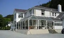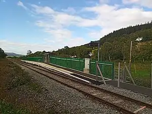The industrial line crossed the river by a substantial girder bridge. The bridge, long used as a footbridge, and the only way to reach the station from the village of Dolgarrog, is now slated for closure.[1] It was initially equipped with two locomotives, ten 12 ton wagons, and two passenger carriages. Morning and evening passenger services were free and operated from 1917 to 1932. Goods traffic, which was heavy during the war, continued but declined in the 1950s. The line closed in 1960 and was lifted in 1964.