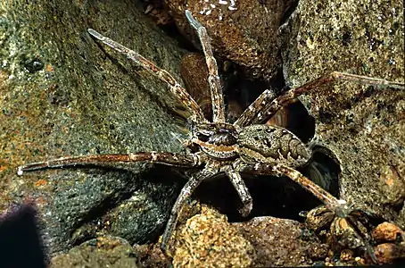 D. dondalei is nocturnal, most active two hours after dusk, and hiding under stones and logs in the daytime. It hunts at the edge of the water at night, placing its legs on the water surface, or anchoring itself to the shore with its back legs with the rest of the body floating, and feeling for vibrations with long sensory hairs on its legs.[3] It then ventures out on the water surface, resting on the surface tension, and can use a silk dragline to stop itself overshooting the target.[4][3] This lets it catch insects and even small fish—the only one of New Zealand's Dolomedes species able to do this in laboratory experiments.[5] To escape predators it dives underwater and hides between stones: it can survive underwater for half an hour, using air trapped on the hairy surface of its body.[4][3]