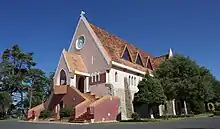 The church is located atop a hill in Da Lat. It is built in a style reminiscent of 17th Century French architecture.[1][4] The walls are made of pink limestome. The church features stained-glass windows and a large 3m of statue of the Virgin Mary standing upon a globe of the world.[1][4] The statue resembles a Vietnamese woman and was designed by French architect Jonchère in 1943. It was donated by Mrs. Decoux. Nicknamed the "Cherry Church" by locals, it is described as a fusion of French and Vietnamese architecture.[5] The French influence can be seen in the walls that allow a "creative manipulation of lights" with the various roofs of the complex designed in the style of the Nha Rong, a type of stilt house typical of the Central Highlands area of Vietnam. The church's façade is designed as an isosceles triangle and is noted for the number of small arch-shaped windows. A cross is located on top of the main triangular portion of the building. The church is part of a complex spanning 29.6 acres (12.0 ha), which also contains two convents.[5]