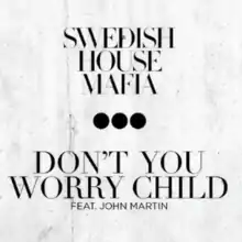 "Don't You Worry Child" is the sixth single released by Swedish house music supergroup Swedish House Mafia. It is the last single from their second compilation album, Until Now, featuring vocals from Swedish singer John Martin. In the United States, it is the act's second number-one single on Billboard's Dance/Mix Show Airplay chart, following "Save the World". It is the group's biggest hit single to date, as well as the final single released before their disbandment in early 2013.[2] It was released to widespread acclaim and received a Grammy nomination for Best Dance Recording in the 2013 Grammy Awards, as did its predecessor, "Save the World", the previous year. The song is written in the key of B minor.[3]