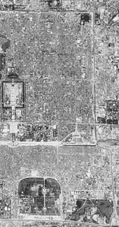 Much of the district is densely developed, with major streets following a grid plan, while the side streets connecting them are irregular. Temple of Heaven Park is the largest, at 267 hectares (660 acres),[7] with the 42.7-hectare (106-acre) Temple of Earth Park in the Hepingli Subdistrict in second. In addition to the parks already mentioned, others of note include Dongdan Park off that street in the central area of the district and Nanguan Park near the northeast corner. Some major arteries also have wide planted median strips. The Russian embassy complex just inside the Ring Road at the northeast corner of the district[8] also has another large planted area, although it is fenced off.[9]