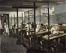 Her work as a war artist included three days at the Bergen-Belsen concentration camp in April 1945, immediately after its liberation.[9][40] Zinkeisen was one of a small number of artists who produced pictures of Bergen-Belsen in the months following its liberation.[41][10] The other artists there included Leslie Cole, Mary Kessell, Sergeant Eric Taylor (one of the camp's liberators), Edgar Ainsworth, and Mervyn Peake.[41] Her painting Human Laundry shows German orderlies washing camp inmates before they go to hospital.[42][43][44] Thomas Sutcliffe, columnist for The Independent described the painting as "flatly representational", "as uninflected as a travel poster", showing "brutalisers obliged to become carers, victims turned to patients".[44] By the time Zinkeisen had become a war artist her palette had already darkened from the colours of her society paintings. Her war paintings use muted greys, browns, and ochres like contemporaries such as Eric Ravilious and Stanley Spencer.