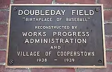 The National Baseball Hall of Fame and Museum was built in the village that served as the location of Doubleday's alleged first game, Cooperstown.[31] An article in the 1920 edition of the Spalding Baseball Guide supported the idea of a monument to Doubleday in Cooperstown. NL president John Heydler offered his backing for Cooperstown's efforts to purchase the grounds where Doubleday was said to have created baseball. In 1923, the village succeeded in buying the property.[32] A baseball stadium—Doubleday Field—was erected there.[33] Around 1934, a baseball said to be from Graves' family was found and purchased by Stephen Carlton Clark, a powerful figure in Cooperstown who created an exhibit in what became the National Baseball Museum around it.[33] The concept of a baseball museum was supported by new NL president Ford Frick, who suggested that a Hall of Fame be created in connection with it.[34] The Hall was subsequently built in Cooperstown.[33] Clark's purchase came to be known as the "Doubleday ball",[35] as the belief arose that it was used by him.[36]