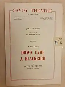 Down Came a Blackbird is a 1953 comedy play by the British writer Peter Blackmore. It was first staged at Q Theatre in London before transferring to the West End where it ran for 53 performances at the Savoy Theatre between 22 December 1953 and 6 February 1954. Directed by Henry Kendall the cast included Peter Arne, Viola Keats, John Loder and Betty Paul.[1] The title is taken from a line in the traditional nursery rhyme Sing a Song of Sixpence. It takes place entirely in the garden room of the Egyptian villa of Sir Clive Dawson.
