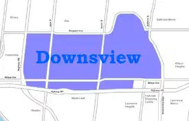 Downsview is a neighbourhood in the north end of Toronto, Ontario, Canada, located in the district of North York. The area takes its name from the Downs View farm established around 1842 near the present-day intersection of Keele Street and Wilson Avenue.[2] It now extends beyond the intersection of Sheppard Avenue and Dufferin Street (the latter which is bypassed by Allen Road in the vicinity of the intersection), though it is popularly seen as including the areas to the north right up to the Toronto city limit at Steeles Avenue. The area includes several large post-World War II subdivisions. Within the area is Downsview Airport, the former site of Canadian Forces Base Downsview, which has since been largely converted following the end of the Cold War into an urban park known as Downsview Park. The airport is still used as a manufacturing and testing facility for Bombardier Aerospace. As of the 2021 census, the Downsview-Roding-CFB neighbourhood was split into the two neighbourhoods of Downsview (east of Roding Street west of Allan Road and between Sheppard Avenue and Highway 401) and Oakdale–Beverley Heights (west of Roding Street east of the CP Rail line just west of Highway 400 also between Sheppard Avenue and Highway 401).