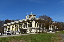 Druid Hill Park is not home to any private residences, according to the official neighborhood boundaries by the city government of Baltimore.[19] However, the Mansion House, located in The Maryland Zoo, which was built in 1801, served as the estate for Colonel Nicholas Rogers and his family until it was converted into a public pavilion in 1863.[20] The only privately owned properties that are somewhat within the general park outline are at the northeastern corner of the park. This small enclave is the Brick Hill historic district dating to 1877, made of small masonry as well as stone duplexes, where those who worked at the Meadow Mill of the Woodberry Manufacturing Company lived. However, this is considered to be a part of the Woodberry neighborhood.[19][21] Many homes face the park in the neighborhoods of Hampden, Liberty Square, Park Circle, Parkview Woodbrook, Reservoir Hill, and Woodberry. The Auchentoroly Terrace, which faces the neighborhood in the Parkview Woodbrook neighborhood, is a historic district of nine blocks built between 1876 and the 1920s in the Victorian style.[22]