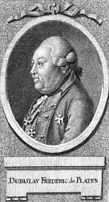 Dubislav Friedrich von Platen (23 August 1714 – 7 June 1787) was a Prussian officer in Frederick the Great's army. A cavalry general, he was also Governor of Königsberg, a Knight of the Order of Saint John, and a recipient of the Order of the Black Eagle. An active cavalry officer in all of the wars fought by Frederick—the War of Austrian Succession, the Second Silesian War, the Seven Years' War and, finally, the War of Bavarian Succession — he was commemorated on Equestrian statue of Frederick the Great in 1851 erected by Frederick's great-great nephew, Frederick William IV.