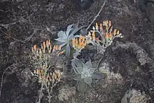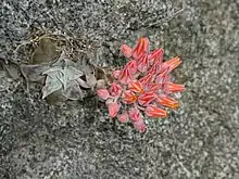 Dudleya cymosa subsp. pumila, most commonly known as the low canyon dudleya,[2] chalky canyon dudleya[3] or California live-forever,[1] is a species of perennial succulent plant. It has diamond to spoon shaped leaves, sometimes coated with a fine white powder, and in May through July, bright red, orange or yellow flowers adorn the short inflorescence.[4] A leaf succulent primarily found growing in rocky cliffs and slopes, it is endemic to California, and grows in the Transverse Ranges and South Coast Ranges, with some outlying populations. A variable plant, in some localities it is difficult to distinguish from other plants in the genus.[5]