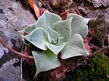 The stem is typically 1 to 2 cm wide, crowned by an apical rosette. The rosettes are often solitary, although some plants may have branching stems with 2-5 rosettes. Each rosette is 4 to 10 cm wide, with 10 to 25 leaves. The leaves are green, and some are glaucous or even farinose, although few are green in times of drought. The leaves are shaped rhombic-oblanceolate to spatulate, with the leaf margins (edges) folding up at the widest point, and the tip shaped generally short-acuminate to mucronate, more or less recurved. The leaves are 1.5 to 5 cm long, and 10 to 30 mm wide.[5][4]