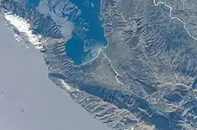 The Dukat plain is delimited by the Ceraunian Mountains, and it is opened in the north towards the Bay of Vlorë on the Adriatic Sea where the Dukat lagoon can be found. With a triangular shape, the plain covers an area of approximately 1,000–1,500 ha.[2][3] The Dukat plain is irrigated by the Dukat river and numerous torrents which descend from the mountains, most prominently that of Llogara.[3] The Llogara Pass at over 1,000 meters of altitude on the Ceraunian Mountains connects the Dukat plain with the Albanian Riviera of the Ionian Sea.[6]