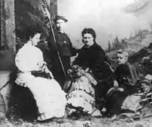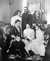 Georg Alexander fell in love with his mother’s lady in waiting Natalia Feodorovna Vanliarskya (Saint Petersburg, 16 May 1858 - Cannes, 14 March 1921), the daughter of Feodor Ardalionovich Vanliarsky (23 December 1833 - 2 February 1903), a Russian State Councillor, who served in the Ministry of Finance, and wife Maria Feodorovna Uvarova, paternal granddaughter of Ardalion Alexeievich Vanliarsky and wife Anastasia Mikhailovna Simanovskaya (? - 26 March 1891) and maternal granddaughter of Feodor Feodorovich Uvarov and wife Maria Petrovna Joukova.[6][7] She was a member of the Russian nobility who came from Germany in 17th century whose name was originally von Lahr.[8] Vanljarskya was a skillful singer and the couple was brought together by their shared passion for music.[9] Grand Duchess Catherine Mikahilovna opposed their union and fired Natalia, hoping that his son would forget the affair and would marry a bride of royal background. However Georg Alexander persisted and in June 1889 he went to Germany to obtain the permission to marry from the head of the family, his uncle, Grand Duke Frederick William (1819-1904). With his uncle's consent, George Georgievich married Natalia Vanliarskya on 14 February 1890 in Saint Petersburg.[1] As Natalia was not of member of reigning royal family their union was treated as morganatic and she received from the Duke of Mecklenburg-Strelitz the title of Countess von Carlow (the name Carlow came from the estate Karlovka in Poltava province, that belonged to Georg-Alexander) on 18 March 1890 that would pass to their children.[8] Their marriage was a happy one and Natalia eventually became loved by her husband’s family.[9]