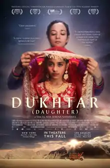 Dukhtar (Urdu: دختر; transl. Daughter) is a 2014 Pakistani drama-thriller film directed by Afia Nathaniel.[2][3] The film stars Samiya Mumtaz, Mohib Mirza, Saleha Aref, Asif Khan, Ajab Gul and Samina Ahmad. The film is Afia Nathaniel's feature directorial debut; she also wrote and produced the film. It is the story of a mother and her ten-year-old daughter,[4] who leave their home to save the girl from an arranged marriage to a tribal leader.[5][6][7][8]
