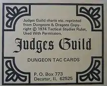 Soon after Gen Con IX, the first subscribers to Judges Guild's subscription format received their Initial Package (1976) in a plain large envelope consisting of loose leaf sheets and stapled booklets. The Initial Package included the Dungeon Tac Cards (1976) by Bill Owen, which were among the first Dungeons & Dragons references published by another company. According to author Shannon Appelcline, "these combat action cards are similar to those used much more recently by Dungeons & Dragons 4th Edition (2008) and Warhammer Fantasy Roleplay 3rd Edition (2009). They contain info for lots of weapons and even new combat tactics like 'jump' and 'punch.'"[2]: 187 Judges Guild began selling Dungeon Tac Cards to stores in 1977.[2]: 190