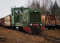 Dymnoye peat railway emerged in the 1967s, in the area Verkhnekamsky District, in a settlement named Svetlopolyansk. The railway was built for hauling peat and workers and operates year-round with several pairs of trains a day. Peat is transshipped on broad gauge 1,520 mm (4 ft 11+2732 in) rail line and taken to Kirov, Sharyu, to a combined heat and power (CHP).[2]