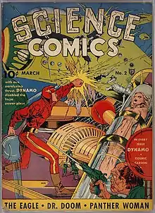 Dynamo is a fictional superhero that appeared in comic books published by Fox Feature Syndicate. He originally appeared in Science Comics #1 (February 1940) under the name Electro. He appeared for the first time as Dynamo in Science Comics #2 (March 1940).[1] The character's name was probably changed to avoid conflict with an earlier character from Timely Comics with the same name.[2]