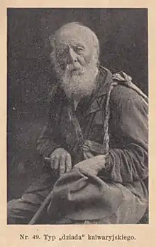 Dziady (plural, lit. "old men, beggars"; singular: dziad), also dziady proszalne ("begging dziady") or dziad kalwaryjski ("calvarian dziad") was a term commonly used in many regions of Poland (as well as in other Slavic countries) to refer to nomadic beggars. Calling beggars dziady was associated with the idea that they have mediumship skills, are a kind of link with the "other world" and representatives of the dead (dziady-ancestors).
