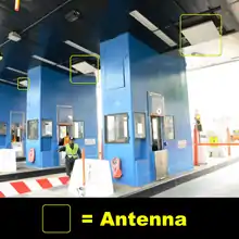 An E-ZPass toll booth in New York City with its transmission antennae highlighted in the yellow boxes