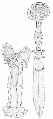 An ear dagger is a relatively rare and exotic form of dagger that was used during the late Middle Ages and Renaissance. It is so named because the pommel of the dagger has a very distinctive shape, somewhat resembling a human ear.[1] Ear daggers frequently have a single sharpened edge that ends in an acute point.